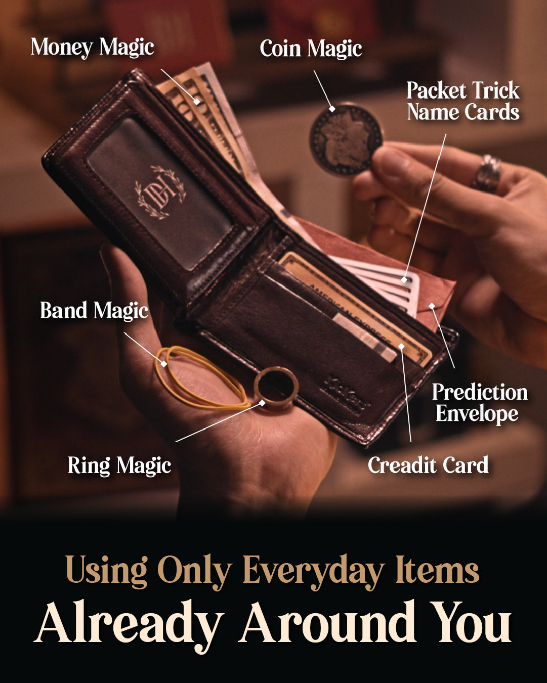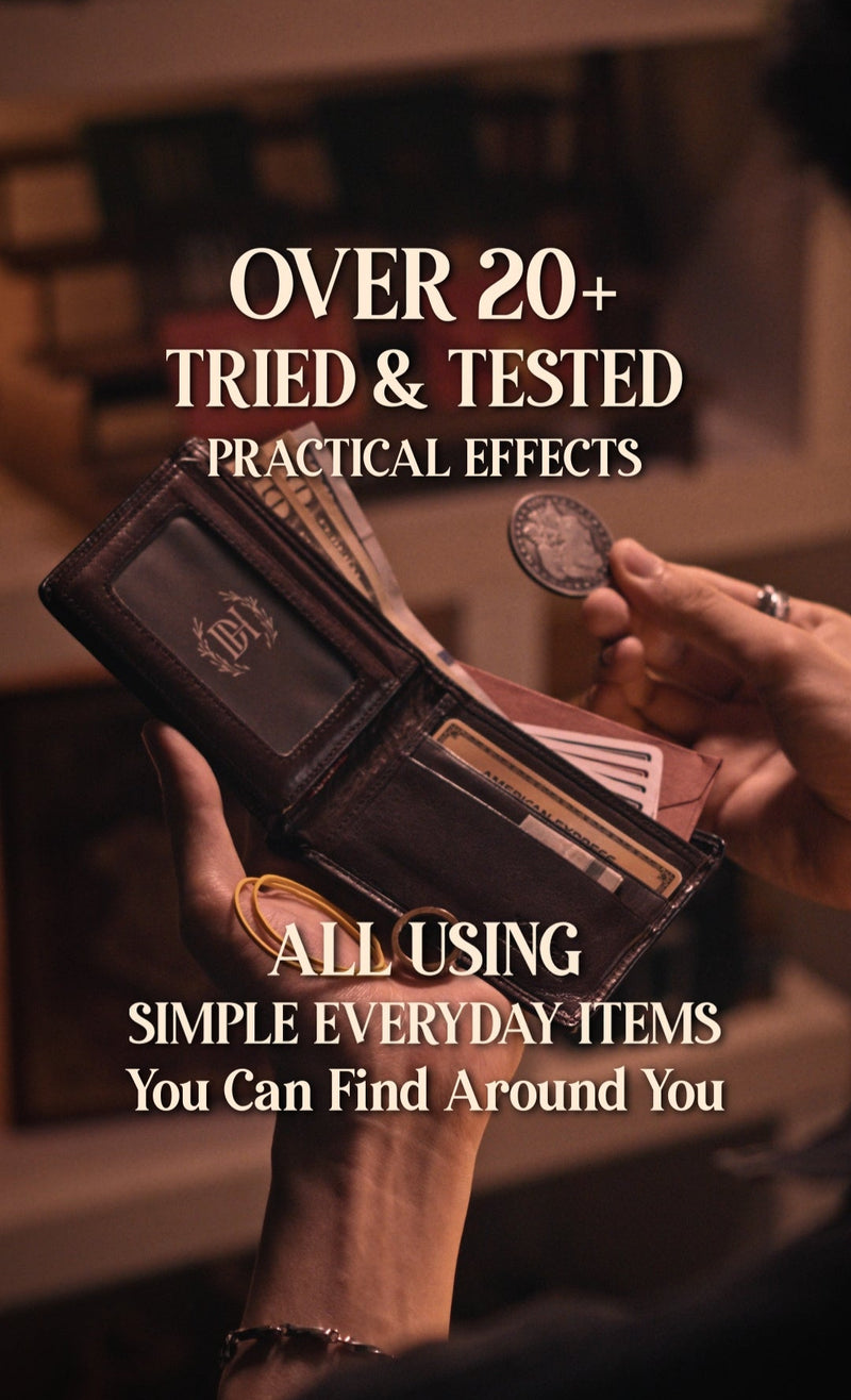 Almost all of the tricks are 100% gimmickless — just everyday items like cards or coins. Only one of them needs a tiny bit of DIY, and that’s it. Everything else is grab-and-go, no special props needed.